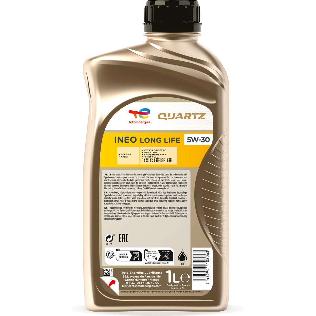 El Total Quartz Ineo Long Life 5W30 es un aceite sintético premium desarrollado por TotalEnergies para motores a gasolina y diésel de última generación. Su avanzada tecnología Low SAPS (bajo contenido en cenizas sulfatadas, fósforo y azufre) protege los sistemas de postratamiento como los filtros de partículas (DPF), manteniendo el motor limpio y eficiente.